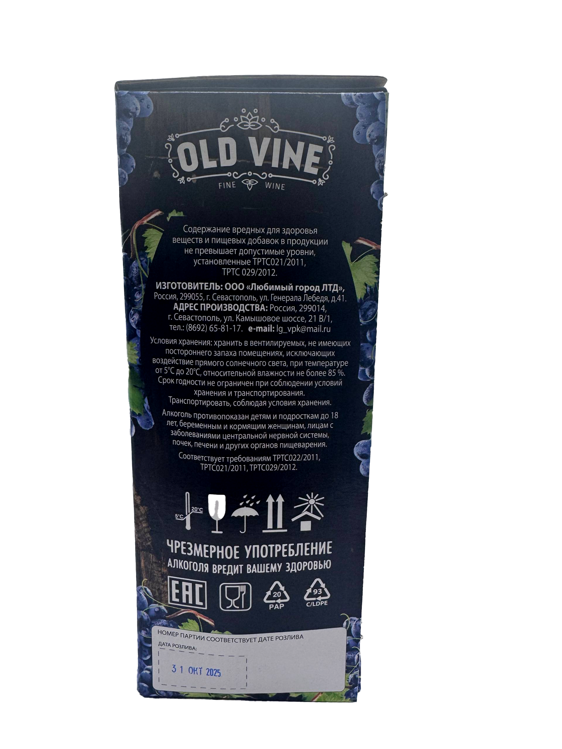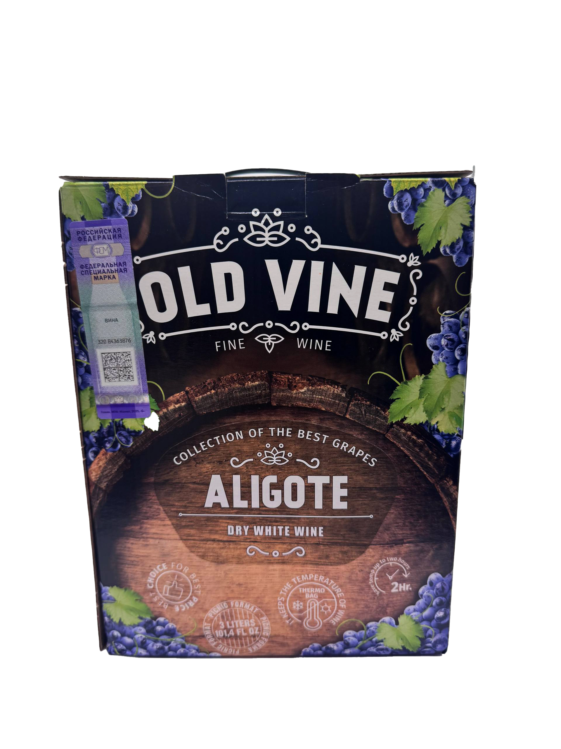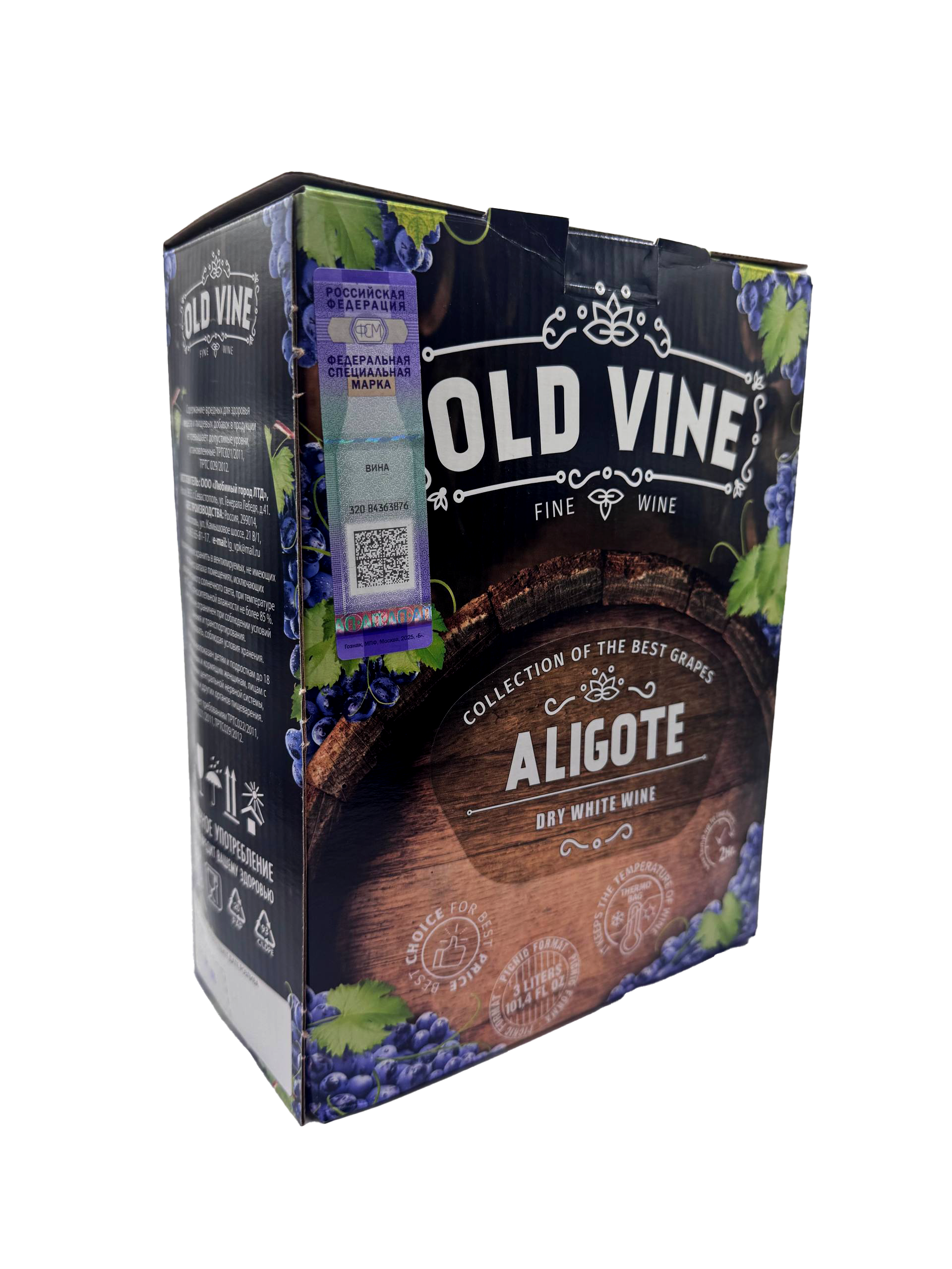 Состав: вино изготовлено из винограда сорта «АЛИГОТЕ», содержит антиокислитель - диоксид серы. Пищевая ценность в 100 мл продукта: углеводы - 0,4 г, белки - 0 г, жиры - 0 г.